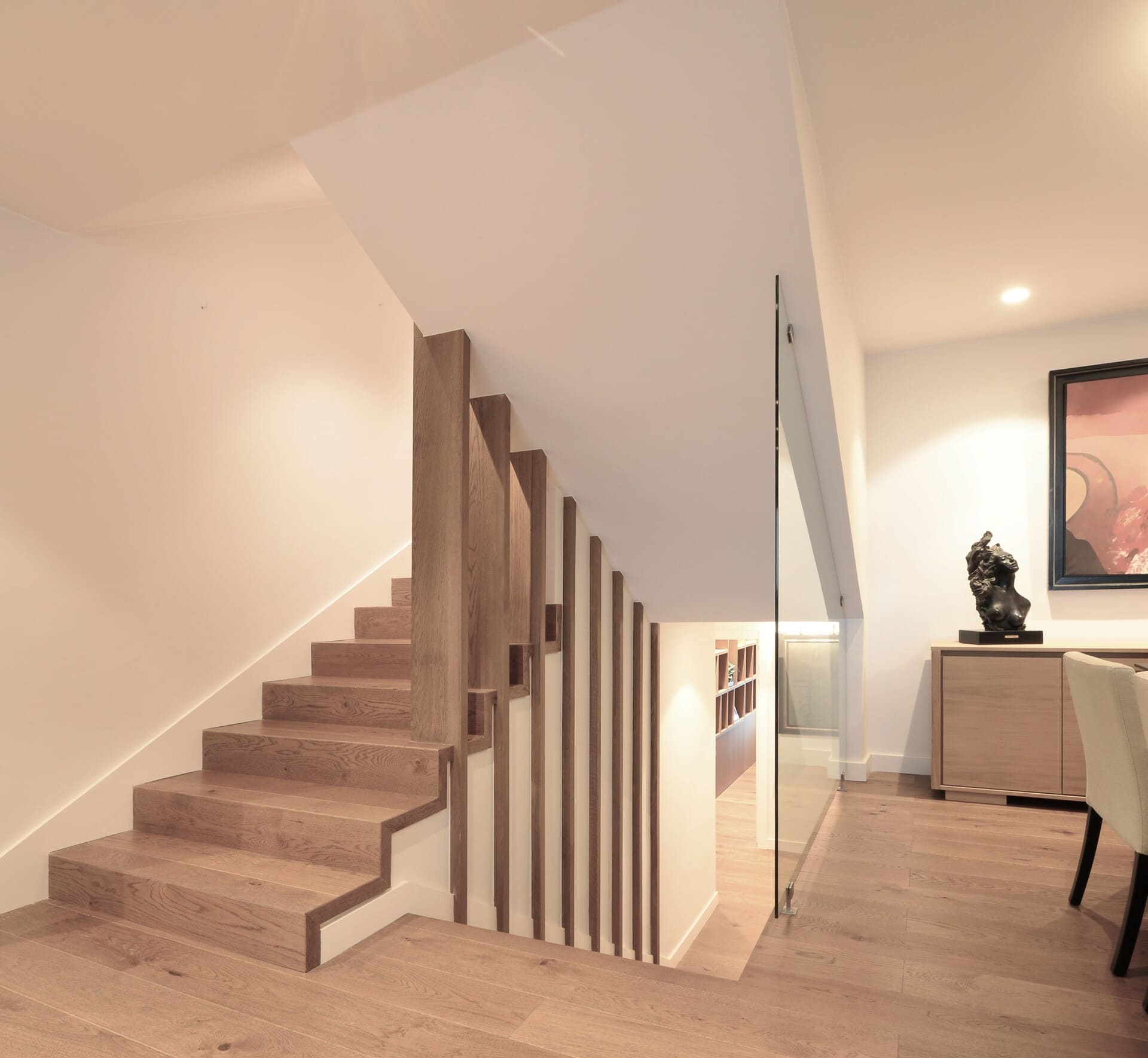 Un dels punts clau de la reforma es troba en l’escala, anteriorment tancada entre envans que feien l’espai més fosc i pesat. Ara, gràcies a l’ús de llistons de fusta verticals i un tancament de cristall, l’escala es converteix en un element protagonista del projecte. Aquesta solució aporta amplitud, permet que la llum flueixi entre nivells i fa que l’habitatge respiri millor, generant una sensació de continuïtat i harmonia en tot el conjunt.