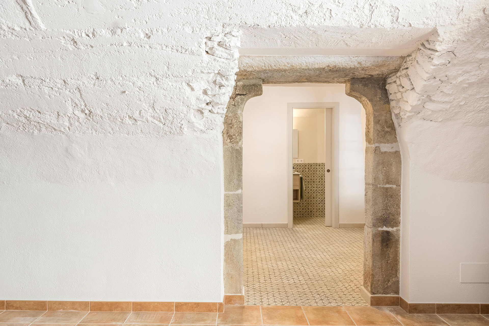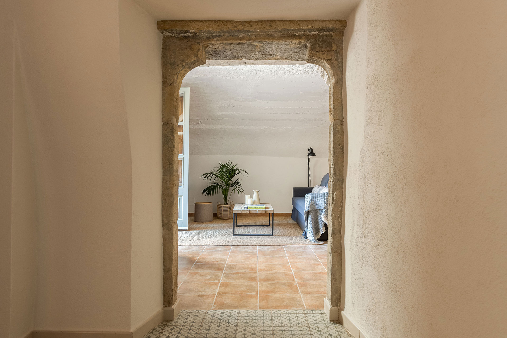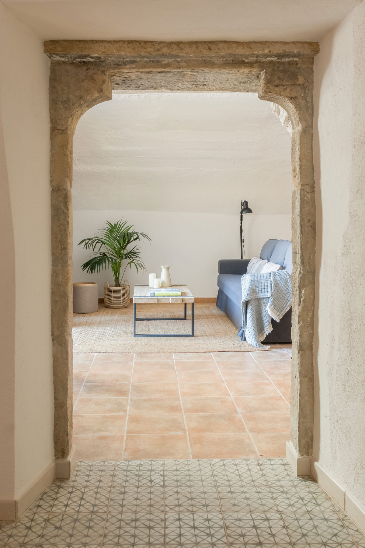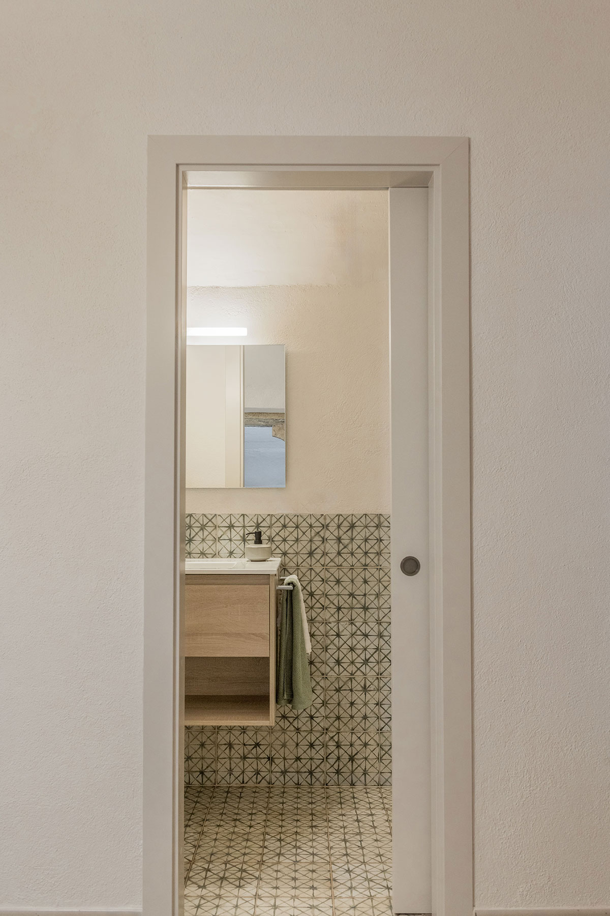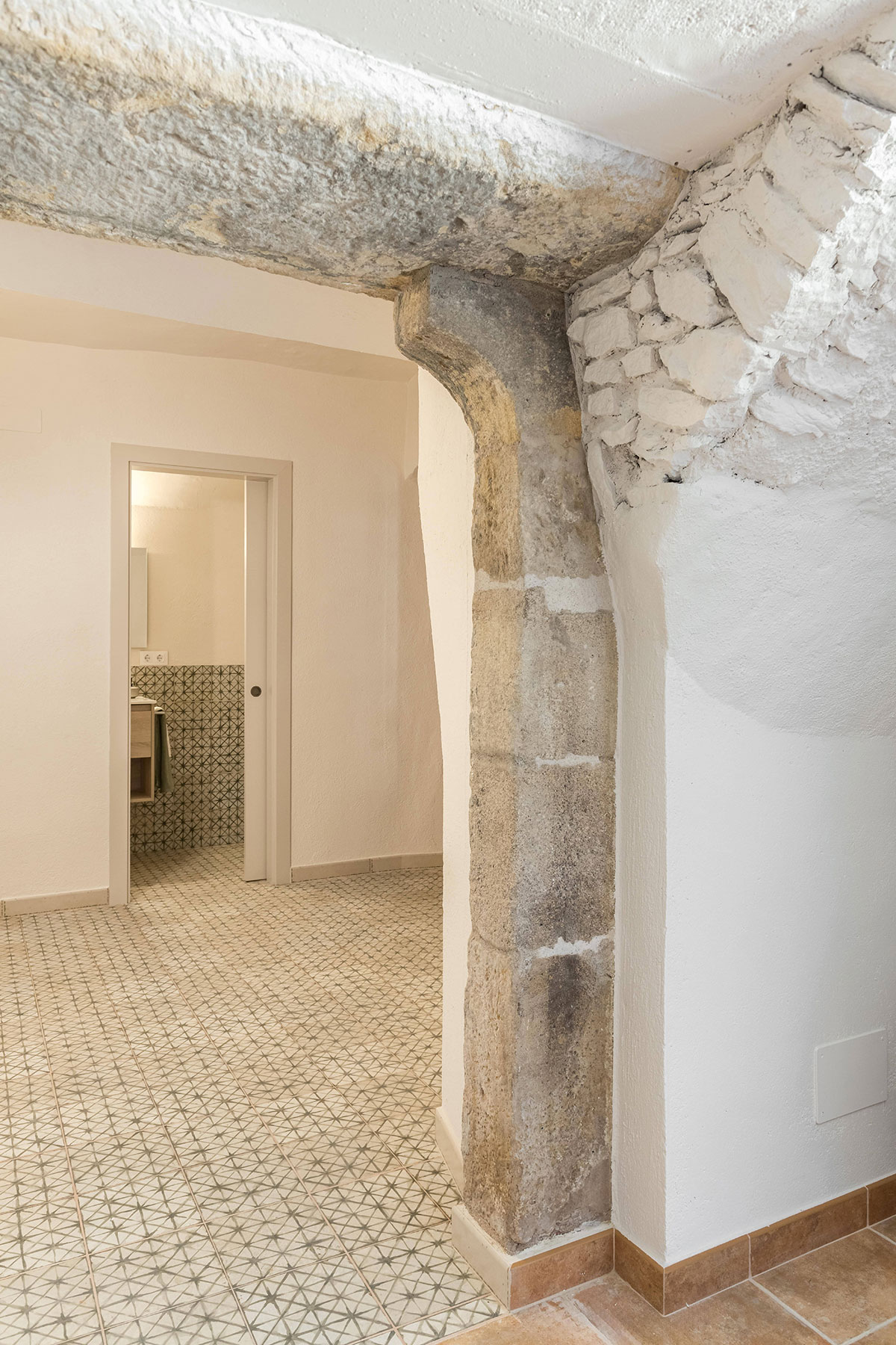 Es conserva gran part del paviment existent ja que estava en bon estat. En la zona de l’entrada i el bany, en haver de passar instal·lacions, no es va poder conservar i decidim col·locar quelcom completament diferent. Un preciós gres d’aspecte artesanal que ho hem portat fins a les parets del bany.