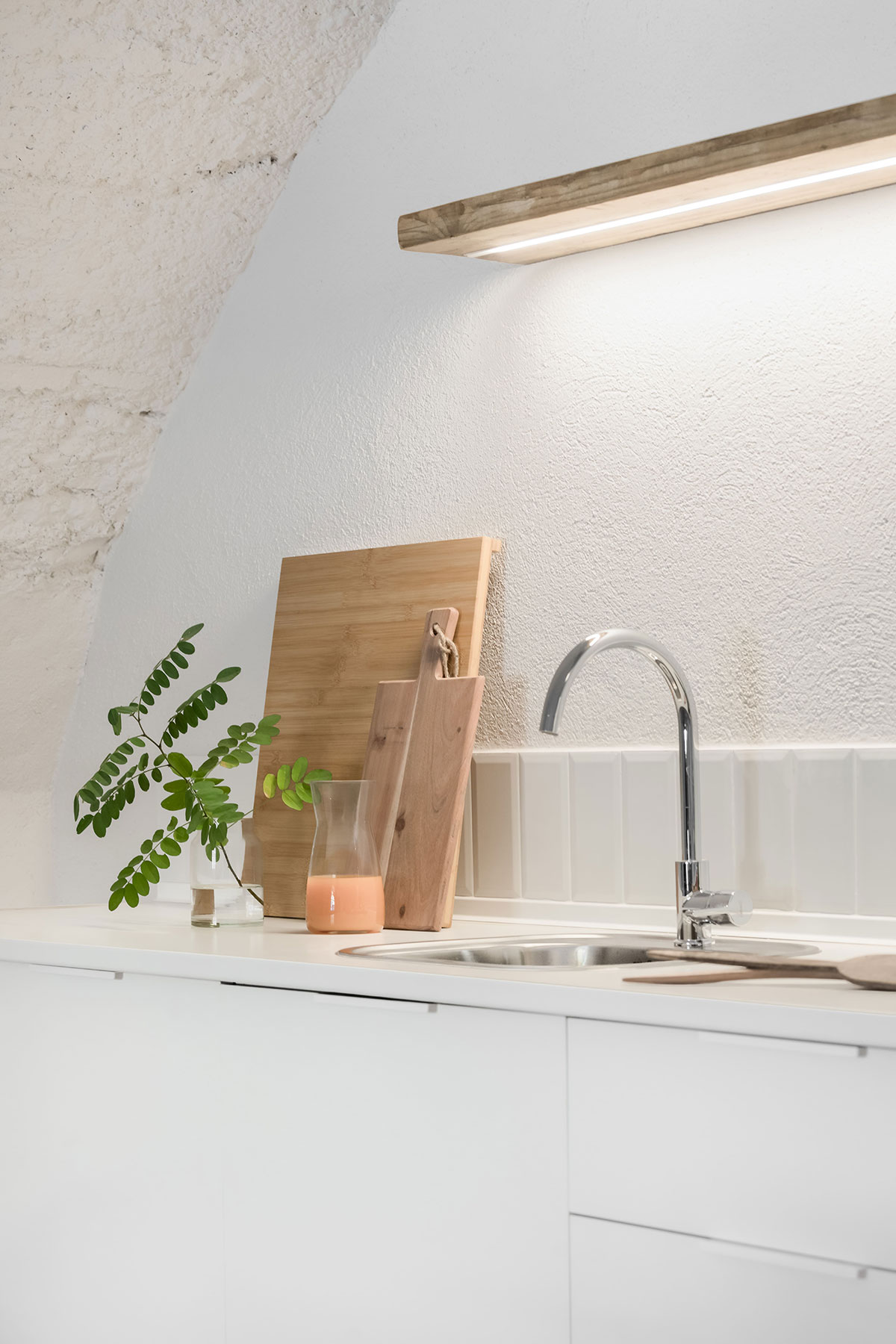 L’encàrrec va ser convertir aquestes dues sales allargades en un apartament. El primer espai s’ha projectat com a entrada, bany i dormitori. Des de l’entrada accedim al segon espai que s’ha deixat sense envans conservant un únic ambient per a la zona de dia: saló-menjador i cuina oberta.