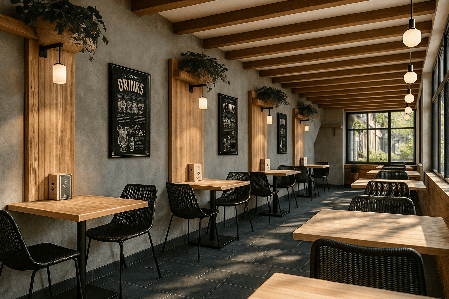 El friso bajo los ventanales se resuelve con un diseño en espiga, aportando dinamismo al conjunto y reforzando la personalidad del espacio. Grandes ventanales de aluminio acabado hierro negro aportan luminosidad y conexión con el exterior, a la vez que enmarcan la estética del local.