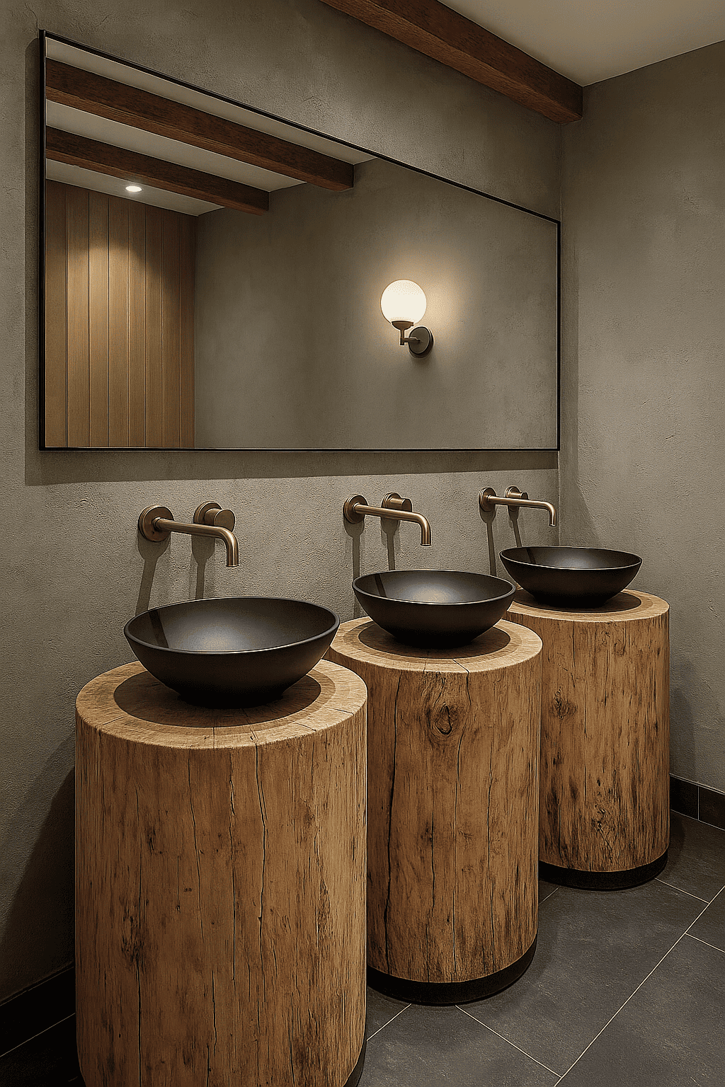 En los baños, la propuesta busca un guiño natural y contemporáneo: lavabos de cerámica negra mate apoyados sobre pedestales de madera maciza que transmiten fuerza y carácter.